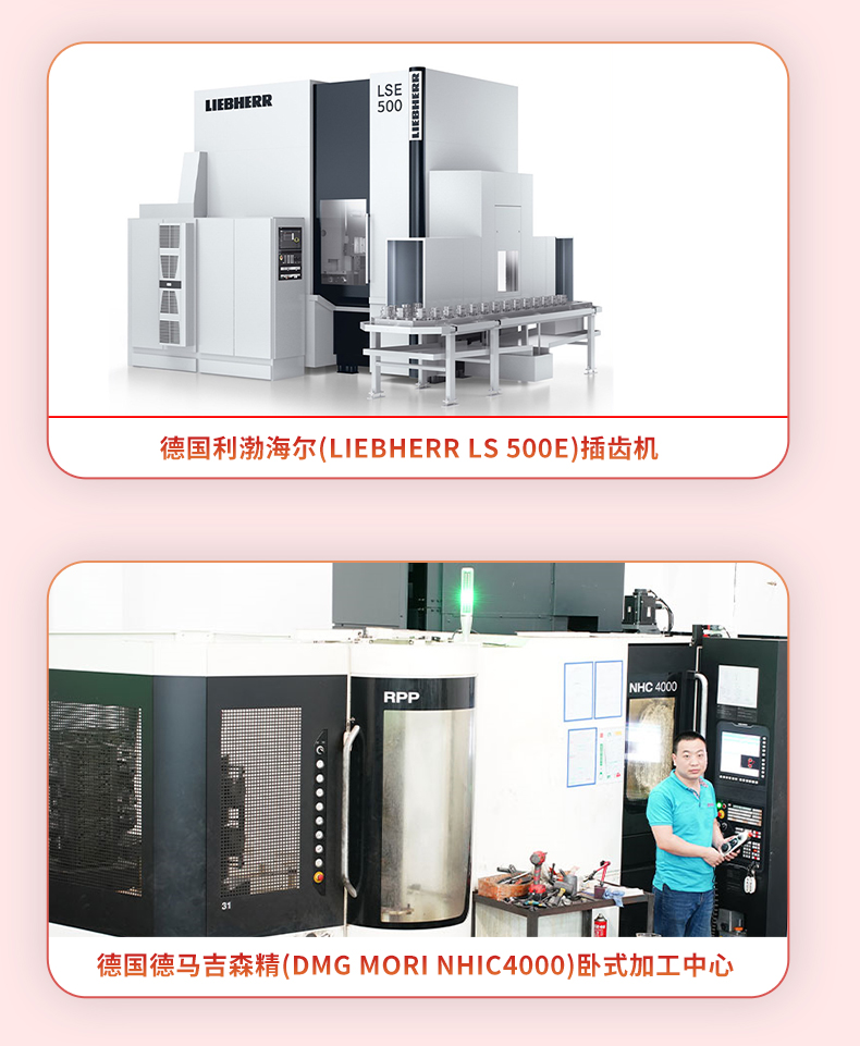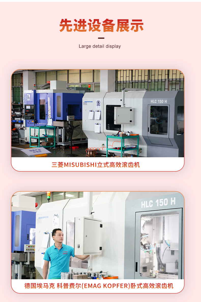 配備車(chē)齒、滾齒、剃齒、研齒、插齒、磨齒等齒輪加工工藝,使用進(jìn)口數(shù)控機(jī)械設(shè)備:日本龍澤車(chē)床、三菱滾齒機(jī)(帶自動(dòng)上下料)、德國(guó)埃馬克科普費(fèi)爾滾齒機(jī)(帶自動(dòng)上下料)、德國(guó)利勃海爾數(shù)控插齒機(jī)、德國(guó)德馬吉DMG臥式加工中心(帶5個(gè)工作臺(tái)) 等。