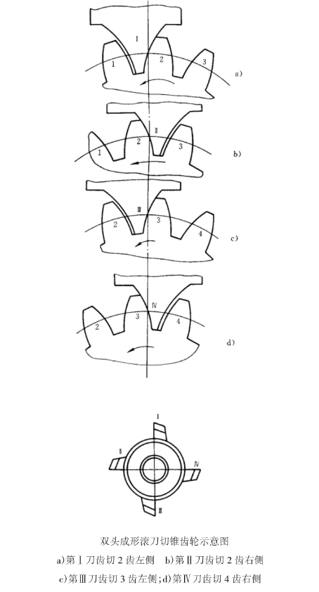 錐齒輪的左右齒形分別由相差90°(雙頭滾刀)和180°(單頭滾刀),且在同一螺旋線上的兩個(gè)刀齒切出,這兩個(gè)主刀刃形成的齒形曲線正好位于工件分度圓上,其中心通過(guò)齒輪中心,這樣就可保證切出的齒輪分度圓上齒厚符合要求。