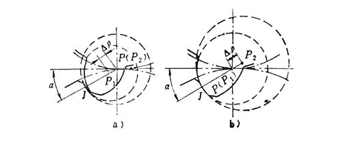 5、1926年,美國(guó)維爾德哈伯(Wildhaber.E.W)根據(jù)上述概念提出圓弧圓柱齒輪方案,凹輪齒廓圓弧半徑P 的圓心在齒條型刀具節(jié)線上,齒面嚙合時(shí),凹齒齒廓圓心P 和節(jié)點(diǎn)P重合,凸齒齒廓圓弧半徑P 比P 小一個(gè) p值,其圓心P 位于名義壓力角 的半徑線JP上(圖1-3a)。這種齒輪沒有制造出來。