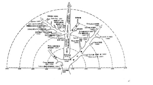 用類似樹枝形式表示齒輪齒形技術(shù)發(fā)展概況的圖。該圖比較形象,比較清楚地表明了各種齒形的發(fā)展順序與年代,同時(shí)反應(yīng)了齒形之間的相互關(guān)系。